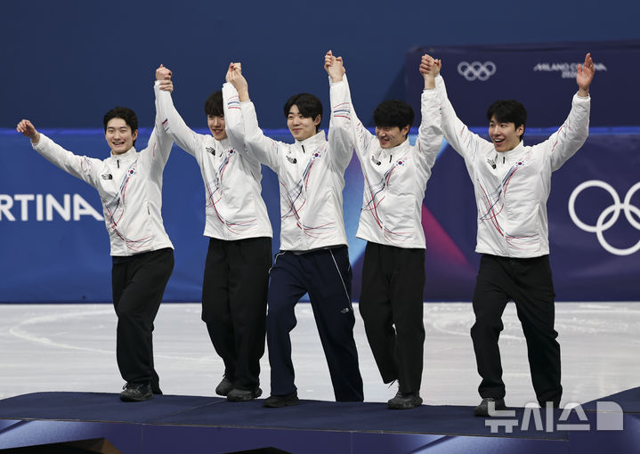 [밀라노=뉴시스] 김근수 기자 = 남자 쇼트트랙 대표팀이 20일(현지 시간) 이탈리아 밀라노 아이스스케이팅 아레나에서 열린 2026 밀라노·코르티나 담페초 동계올림픽 쇼트트랙 남자 계주 5000m 시상식에서 기뻐하고 있다. 왼쪽부터 신동민, 임종언, 이준서, 이정민, 황대헌. 2026.02.21. [email protected]