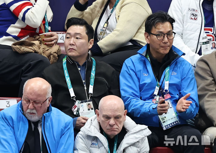 [밀라노=뉴시스] 김근수 기자 = 가수 싸이가 20일(현지 시간) 이탈리아 밀라노 아이스스케이팅 아레나를 찾아 2026 밀라노·코르티나 담페초 동계올림픽 쇼트트랙 경기를 관람하고 있다. 오른쪽은 김재열 국제빙상경기연맹(ISU) 회장 겸 국제올림픽위원회(IOC) 집행위원. 2026.02.21. [email protected]