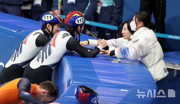 [밀라노=뉴시스] 박주성 기자 = 20일 (현지 시간) 이탈리아 밀라노 아이스 스케이팅 아레나 경기장에서 열린 2026 밀라노·코르티나담페초 동계올림픽 쇼트트랙 남자 5000m 계주 결승에서 은메달을 차지한 이정민(왼쪽부터), 임종언이 이소연, 심석희에게 축하받고 있다. 2026.02.21. [email protected]