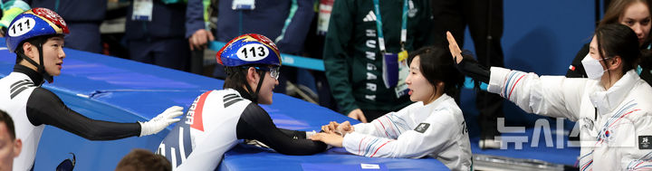 [밀라노=뉴시스] 박주성 기자 = 20일 (현지 시간) 이탈리아 밀라노 아이스 스케이팅 아레나 경기장에서 열린 2026 밀라노·코르티나담페초 동계올림픽 쇼트트랙 남자 5000m 계주 결승에서 은메달을 획득한 임종언과 이정민을 여자 대표팀 이소연, 심석희가 축하해주고 있다. 2026.02.21. [email protected]