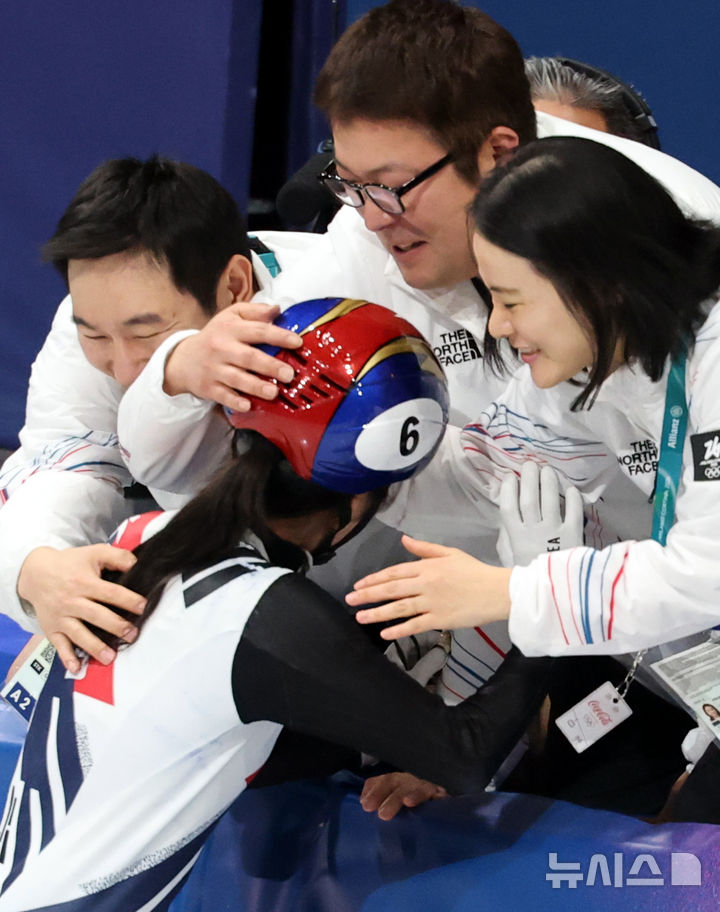 [밀라노=뉴시스] 박주성 기자 = 20일 (현지 시간) 이탈리아 밀라노 아이스 스케이팅 아레나 경기장에서 열린 2026 밀라노·코르티나담페초 동계올림픽 쇼트트랙 여자 1500m 결승에서 김길리가 금메달을 획득한 후 코칭스테프와 기쁨을 나누고 있다. 2026.02.21. [email protected]