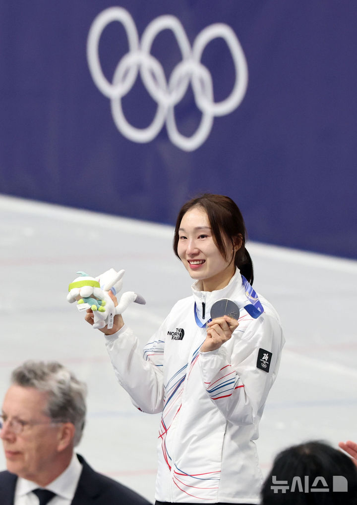 [밀라노=뉴시스] 박주성 기자 = 20일 (현지 시간) 이탈리아 밀라노 아이스 스케이팅 아레나 경기장에서 열린 2026 밀라노·코르티나담페초 동계올림픽 쇼트트랙 여자 1500m 시상식에서 은메달을 획득한 최민정이 포즈를 취하고 있다. 2026.02.21. [email protected]