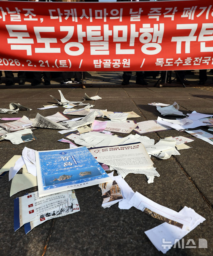 [서울=뉴시스] 최진석 기자 = 21일 서울 종로구 탑골공원 삼일문 앞에서 열린 일본정부의 독도강탈만행 규탄 기자회견에서 독도수호전국연대 회원들이 다케시마(竹島·일본이 주장하는 독도의 명칭)의 날 홍보 책자를 찢는 퍼포먼스를 하고 있다.