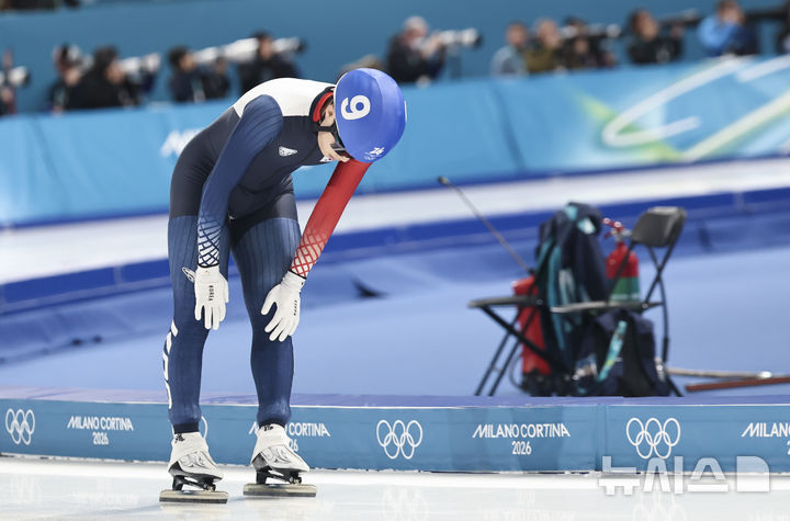 [밀라노=뉴시스] 김근수 기자 = 스피드스케이팅 조승민이 21일(현지시간) 이탈리아 밀라노 스피드스케이팅 스타디움에서 열린 2026 밀라노·코르티나담페초 동계올림픽 스피드 스케이팅 남자 매스 스타트 준결승에서 질주를 마친 뒤 아쉬워하고 있다. 2026.02.21. [email protected]