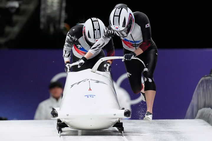 [코르티나담페초=AP/뉴시스] 김유란(오른쪽)과 전은지가 21일(현지 시간) 이탈리아 코르티나담페초 코르티나 슬라이딩 센터에서 열린 2026 밀라노·코르티나담페초 동계올림픽 봅슬레이 여자 2인승 경기를 펼치고 있다. 김유란-전은지는 1~4차 주행 합계 3분52초04로 16위를 기록했다. 2026.02.22.