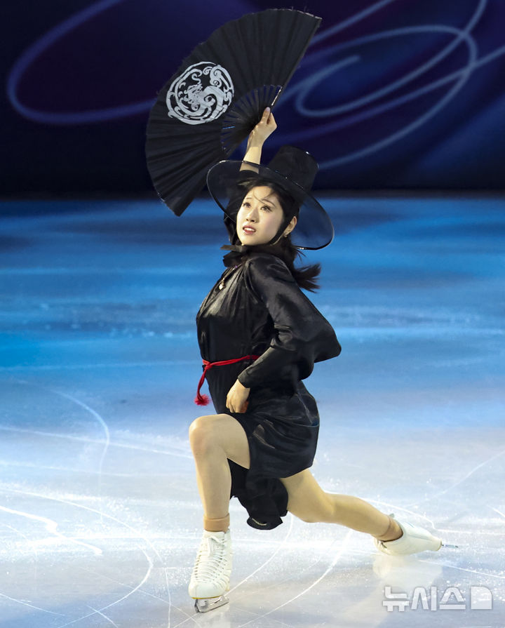 [밀라노=뉴시스] 김근수 기자 = 피겨스케이팅 이해인이 21일(현지 시간) 이탈리아 밀라노 아이스 스케이팅 아레나에서 열린 피겨스케이팅 갈라쇼에서 넷플릭스 애니메이션 '케이팝 데몬 헌터스(K-Pop Demon Hunters)' 컨셉을 반영한 저승사자(사자보이즈) 복장을 입고 연기를 펼치고 있다. 2026.02.22. [email protected]