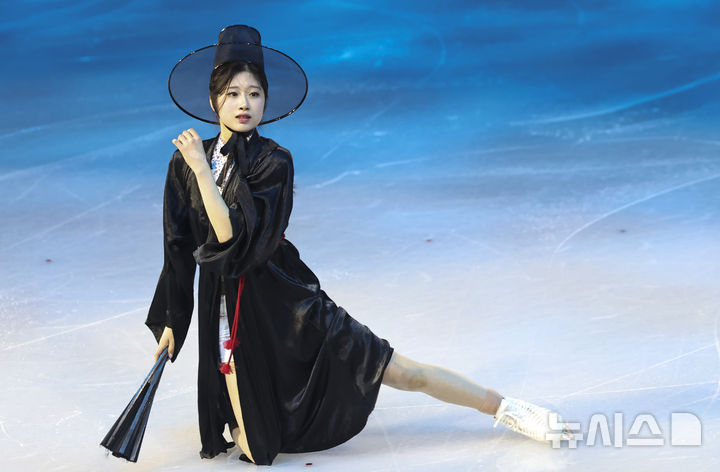 [밀라노=뉴시스] 김근수 기자 = 피겨스케이팅 이해인이 21일(현지 시간) 이탈리아 밀라노 아이스 스케이팅 아레나에서 열린 피겨스케이팅 갈라쇼에서 넷플릭스 애니메이션 '케이팝 데몬 헌터스(K-Pop Demon Hunters)' 컨셉을 반영한 저승사자(사자보이즈) 복장을 입고 연기를 펼치고 있다. 2026.02.22. [email protected]