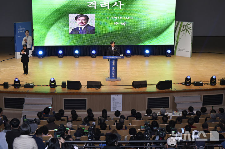 [담양=뉴시스] 박기웅 기자 = 조국 조국혁신당 대표가 22일 오후 전남 담양문화회관에서 열린 정철원 담양군수 출판기념회에서 격려사를 하고 있다. 2026.02.22. [email protected]