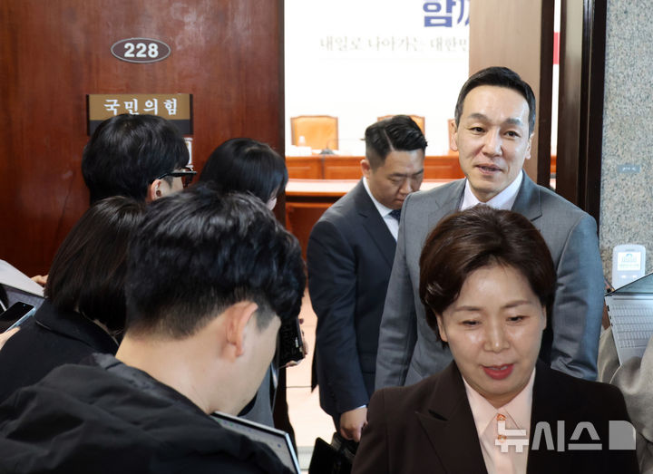 [서울=뉴시스] 김금보 기자 = 국민의힘 양향자, 김민수 최고위원이 22일 오후 서울 여의도 국회에서 비공개 최고위원회의를 마친 뒤 회의장을 나서고 있다.