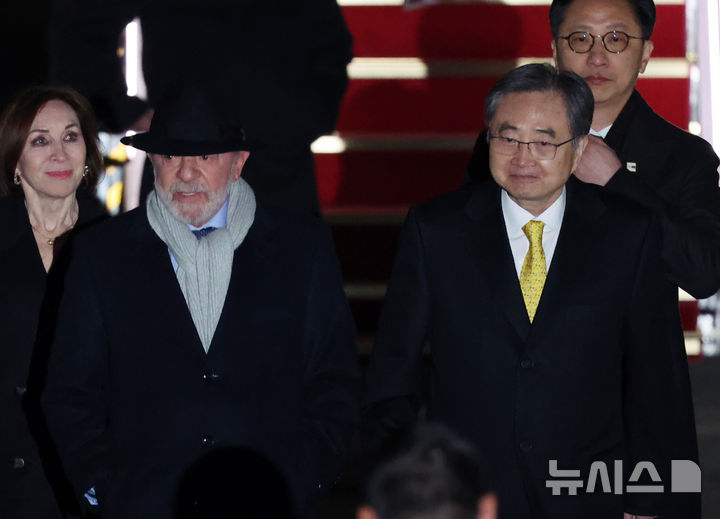 [성남=뉴시스] 배훈식 기자 = 루이스 이나시우 룰라 다시우바(왼쪽) 브라질 대통령이 22일 오후 경기 성남시 서울공항에 도착해 조현 외교부 장관과 이동하고 있다. 2026.02.22. [email protected]