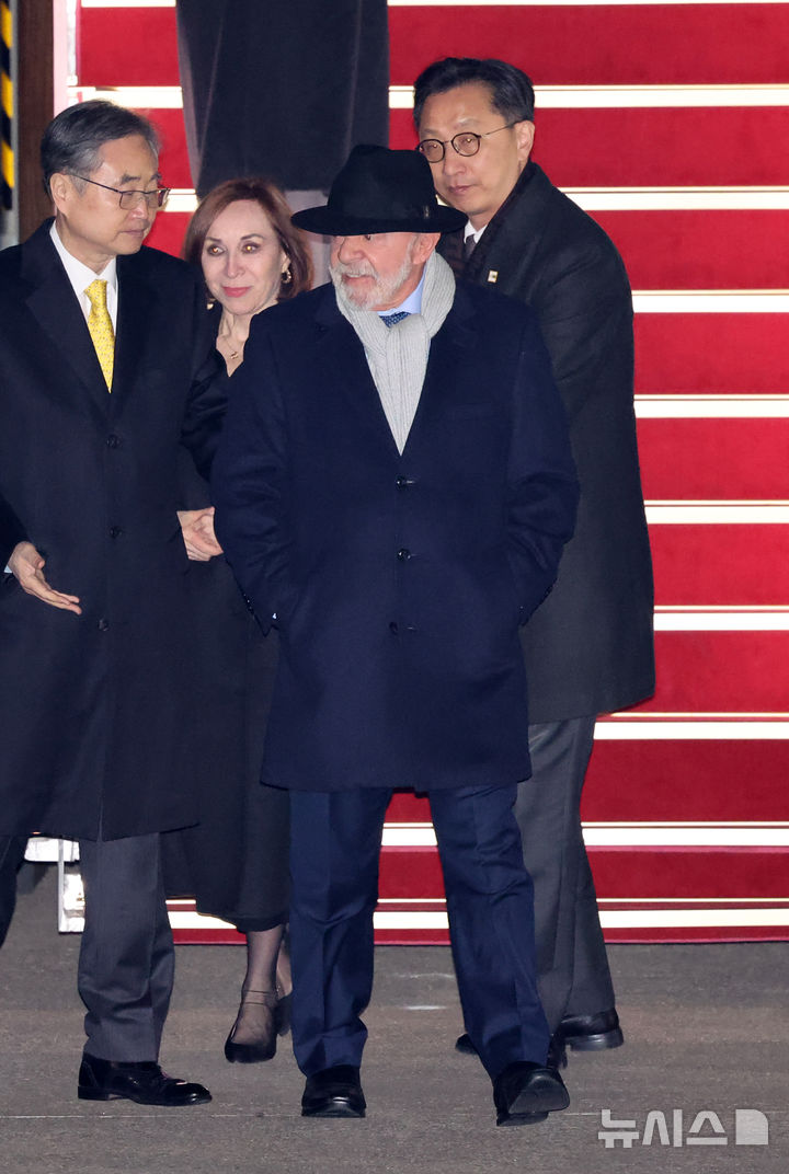 [성남=뉴시스] 배훈식 기자 = 루이스 이나시우 룰라 다시우바 브라질 대통령이 22일 오후 경기 성남시 서울공항에 도착해 이동하고 있다. 2026.02.22. [email protected]