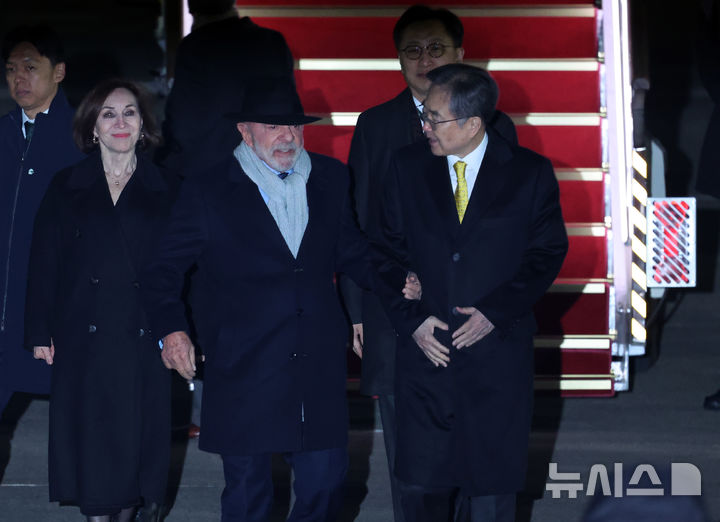 [성남=뉴시스] 배훈식 기자 = 루이스 이나시우 룰라 다시우바 브라질 대통령이 22일 오후 경기 성남시 서울공항에 도착해 조현 외교부 장관의 영접을 받으며 이동하고 있다. 2026.02.22. [email protected]