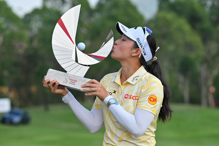 [파타야=AP/뉴시스] 지노 티띠꾼(태국)이 22일(현지 시간) 태국 파타야 시암 컨트리클럽에서 열린 미국여자프로골프(LPGA) 투어 혼다 타일랜드 정상에 올라 트로피를 들고 입 맞추고 있다. 티띠꾼은 최종 합계 24언더파 264타로 우승을 차지했다. 2026.02.23.