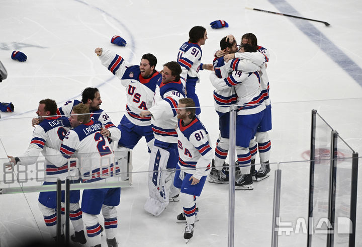 [밀라노=뉴시스] 김근수 기자 = 22일(현지시간) 이탈리아 밀라노 산타줄리아 IHO 아레나에서 열린 2026 밀라노·코르티나담페초 동계올림픽 아이스 하키 남자 금메달 결정전에서 금메달을 차지한 미국 선수들이 기뻐하고 있다.
