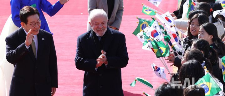 [서울=뉴시스] 최동준 기자 = 이재명 대통령과 브라질 루이스 이나시우 룰라 다 시우바 대통령이 23일 청와대에서 열린 공식 환영식에서 어린이들과 인사하고 있다. 2026.02.23. [email protected]