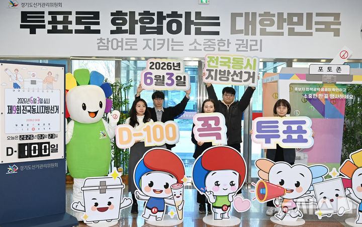 [수원=뉴시스] 김종택 기자 = 제9회 전국동시지방선거를 100일 앞둔 23일 경기 수원시 영통구 경기도선거관리위원회에서 선관위 직원들이 D-100일 카운트다운 홍보 퍼포먼스를 하고 있다. 2026.02.23. [email protected]