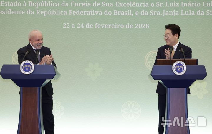 [서울=뉴시스] 최동준 기자 = 이재명 대통령이 23일 청와대에서 한-브라질 공동 언론발표를 한 뒤 브라질 루이스 이나시우 룰라 다 시우바 대통령과 함께 박수를 치고 있다. 2026.02.23. [email protected]