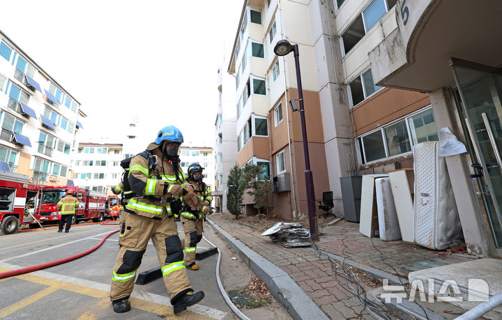 [서울=뉴시스] 조성우 기자 = 23일 오후 서울 노원구 하계5단지 아파트에서 열린 스프링클러 미설치 노후 임대주택 대안 모색 및 안전 피해 저감을 위한 공동주택 실물화재 합동실험에서 소방대원들이 화재 진압을 위해 투입되고 있다. 2026.02.24. [email protected]