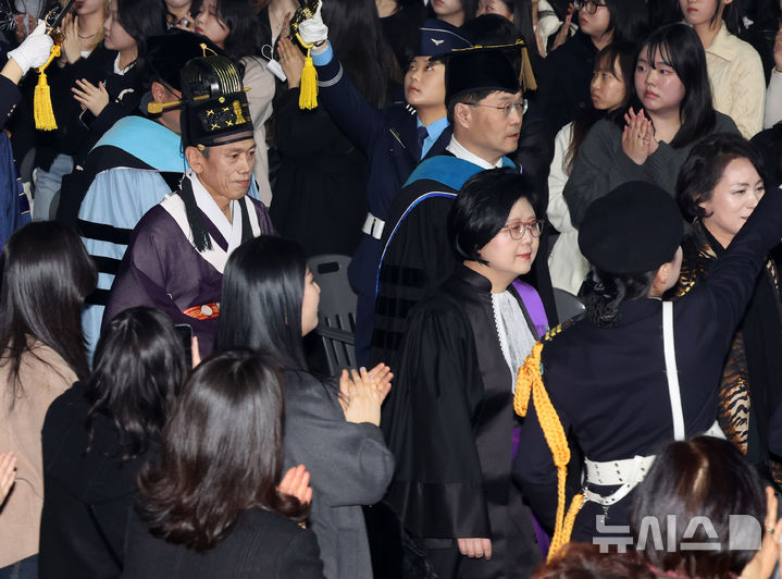 [서울=뉴시스] 배훈식 기자 = 문시연 숙명여자대학교 총장과 대한황실의 장손이자 고종황제와 순헌황귀비의 증손자인 이준 황손이 23일 오후 서울 중구 장충체육관에서 열린 2026학년도 입학식에 참석하고 있다. 2026.02.23. [email protected]