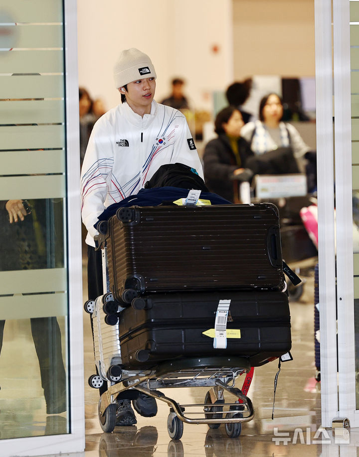 [인천공항=뉴시스] 김명년 기자 = 대한민국 피겨스케이팅 국가대표 차준환이 23일 오후 인천국제공항 제2여객터미널에서 2026 밀라노·코르티나 동계 올림픽을 마치고 귀국하고 있다. 차준환은 이번 올림픽 남자 싱글에서 역대 최고성적인 4위를 기록했다. 2026.02.23. [email protected]