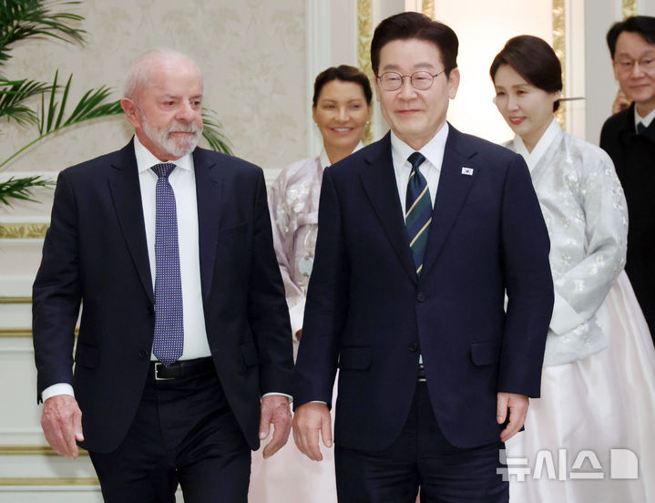 [서울=뉴시스] 최동준 기자 = 이재명 대통령과 브라질 루이스 이나시우 룰라 다 시우바 대통령이 23일 청와대에서 열린 국빈 방한 환영 만찬에 입장하고 있다. (청와대통신사진기자단) 2026.02.22. [email protected]