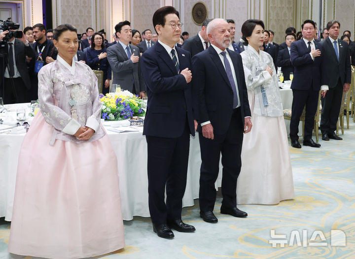 [서울=뉴시스] 최동준 기자 = 이재명 대통령과 김혜경 여사가 23일 청와대에서 열린 브라질 루이스 이나시우 룰라 다 시우바 대통령, 부인 잔자 룰라 다 시우바 여사 국빈 방한 환영 만찬에서 국민의례를 하고 있다. (청와대통신사진기자단) 2026.02.22. [email protected]