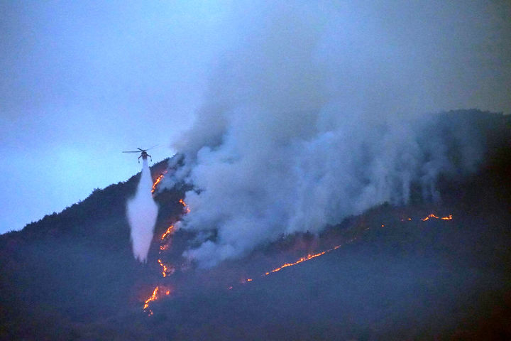 [밀양=뉴시스] 산림청 산불진화헬기가 24일 경남 밀양 삼랑진읍 검세리 일원에서 발생한 산불현장에 투입돼 진화 작업을 위한 물 투화를 하고 있다. (사진=산림청 제공) 2026.02.24. [email protected]