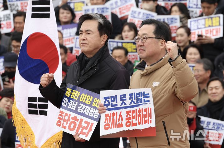 [서울=뉴시스] 조성봉 기자 = 김태흠 충남도지사와 이장우 대전시장이 24일 오후 서울 여의도 국회 본청 계단에서 열린 대전·충남 졸속 통합 반대 범시·도민 총궐기대회에서 참가자들에게 인사를 하고 있다.2026.02.24. [email protected]
