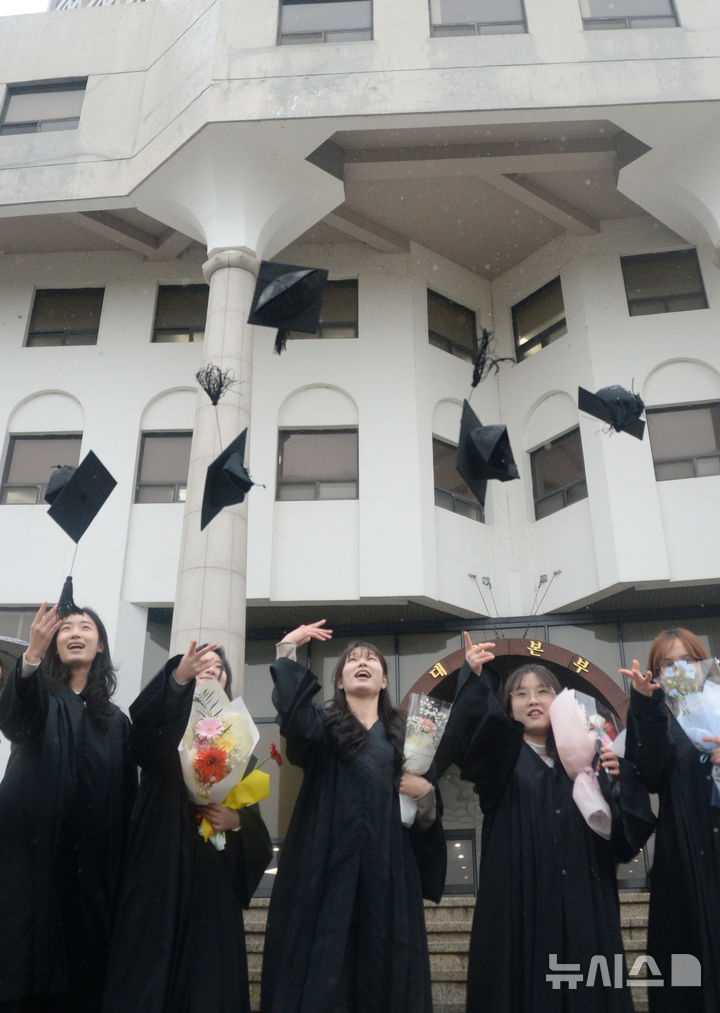 [완주=뉴시스] 김얼 기자 = 우석대학교 2025학년도 전기 학위수여식 날인 24일 전북 완주군 우석대학교에서 졸업생이 학사모를 던지며 서로의 졸업을 축하하고 있다. 2026.02.24. [email protected]