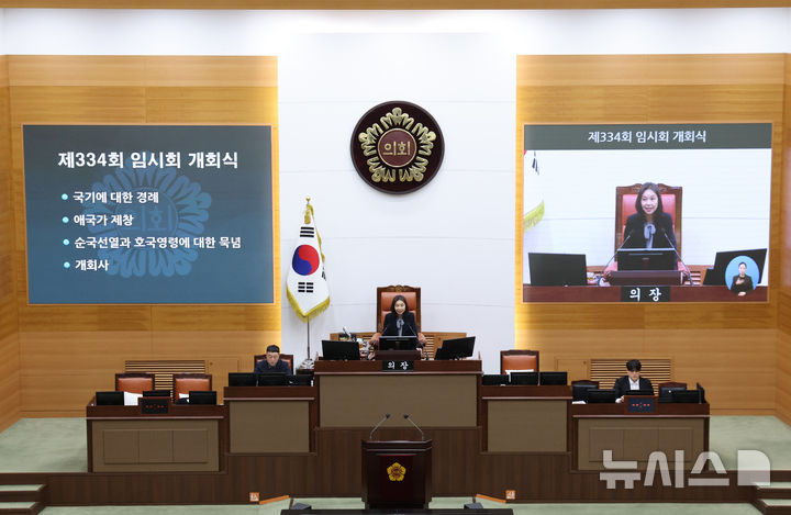 [서울=뉴시스] 황준선 기자 = 최호정 서울시의회 의장이 24일 오후 서울 중구 서울특별시의회에서 열린 서울시의회 제334회 임시회 개회식에서 개회사를 하고 있다. 2026.02.24. [email protected]