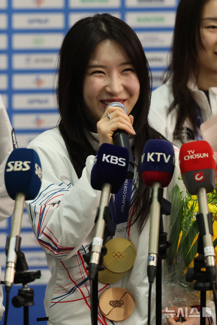 [인천공항=뉴시스] 권창회 기자 = 2026 밀라노-코르티나 동계올림픽 쇼트트랙 금메달리스트 김길리가 24일 오후 인천국제공항 제2여객터미널로 귀국해 인터뷰 하고 있다. 2026.02.24. [email protected]