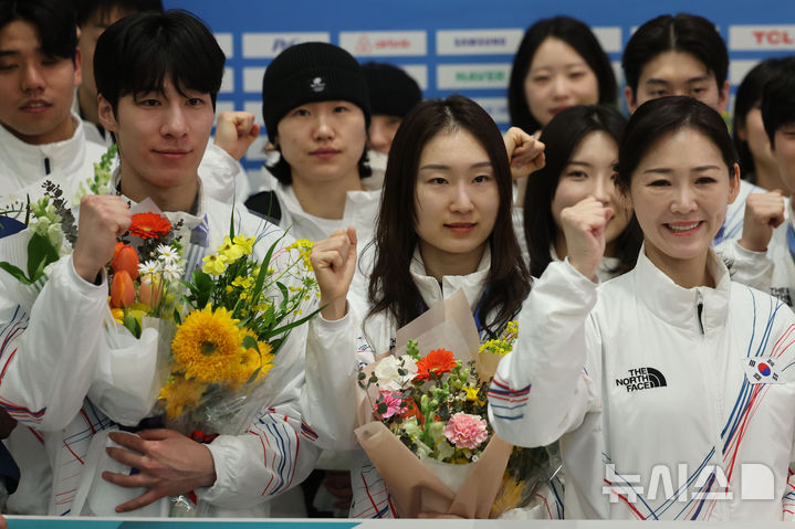 [인천공항=뉴시스] 권창회 기자 = 2026 밀라노-코르티나 동계올림픽 선수들이 24일 오후 인천국제공항 제2여객터미널로 귀국해 기념촬영을 하고 있다. 2026.02.24. [email protected]