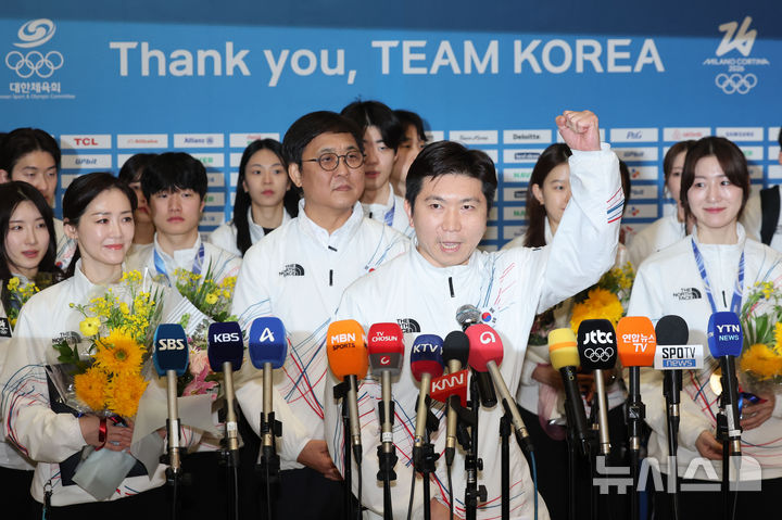 [인천공항=뉴시스] 권창회 기자 = 유승민 대한체육회장이 24일 오후 인천국제공항 제2여객터미널로 귀국해  2026 밀라노-코르티나 동계올림픽 선수단을 격려하고 있다. 2026.02.24. [email protected]