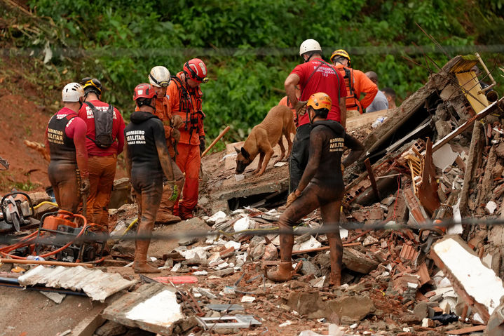 [주이스지포라=AP/뉴시스] 24일(현지 시간) 브라질 미나스제라이스주 주이스지포라의 홍수로 인한 주택 붕괴 현장에서 구조대가 탐지견을 동원해 수색하고 있다. 브라질 남동부 지역을 강타한 폭우와 홍수로 지금까지 최소 25명이 숨지고 43명이 실종됐다. 2026.02.25.