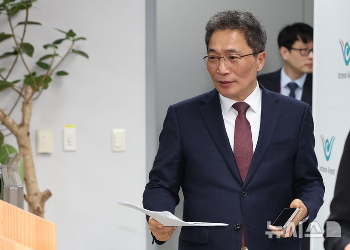 [인천공항=뉴시스] 이영환 기자 = 사의를 표명한 이학재 인천국제공항공사 사장이 25일 오전 인천국제공항 제1여객터미널 기자실에서 열린 기자간담회에 참석하고 있다. 2026.02.25. [email protected]