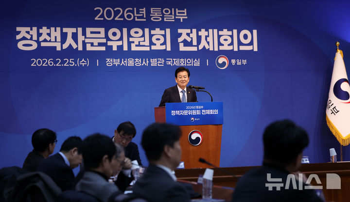 [서울=뉴시스] 김선웅 기자 = 정동영 통일부 장관이 25일 서울 종로구 정부서울청사에서 열린 2026년 통일부 정책자문위원회 전체회의 및 신임 위원 위촉식에서 인사말을 하고 있다. 2026.02.25. [email protected]