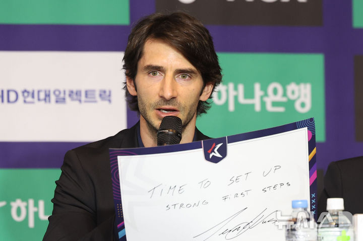 [서울=뉴시스] 권창회 기자 = 제라드 누스 파주 프런티어FC 감독이 25일 서울 서대문구 스위스그랜드호텔에서 열린 2026 K리그2 개막 미디어데이에서 올시즌 각오를 밝히고 있다. 2026.02.25. [email protected]