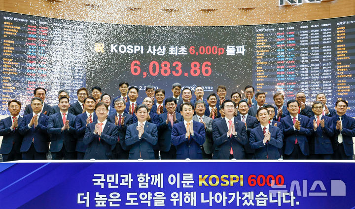 [서울=뉴시스] 정병혁 기자 = 정은보(아랫줄 왼쪽 세번째) 한국거래소 이사장과 이찬진 금융감독원장, 이억원 금융위원장, 황성엽 금투협회장, 강민국 정무위원회 국민의힘 간사가 25일 서울 영등포구 한국거래소에서 열린 코스피 6000p 기념행사에서 기념촬영을 하고 있다. (공동취재) 2026.02.25. [email protected]