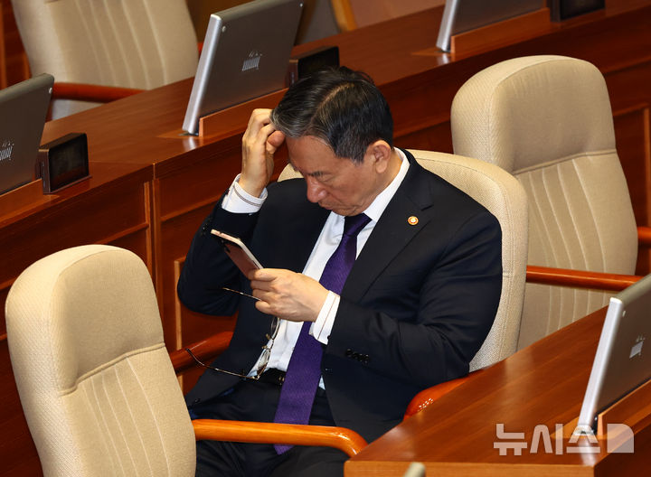 [서울=뉴시스] 김명년 기자 = 정성호 법무부장관이 25일 서울 여의도 국회에서 열린 제432회 국회(임시회) 제8차 본회의에서 머리를 만지고 있다. 2026.02.25. [email protected]