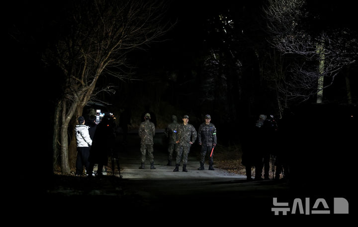 [영주=뉴시스] 이무열 기자 = 25일 공군 F-16C 전투기가 추락한 경북 영주시 안정면 용산리 한 야산에서 공군 관계자들이 진입로를 통제하고 있다.