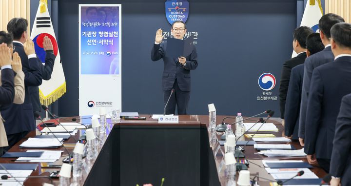 [인천=뉴시스] 김양수 기자 = 26일 인천세관에서 열린 '청렴실천 선언·서약식'에서 이명구 청장이 관세 공무원 반부패 청렴 선언서를 낭독하고 있다.(사진=관세청 제공). [email protected]
