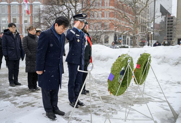 [서울=뉴시스] 안규백 국방부 장관이 25일(현지 시간) 캐나다 국립 전쟁 기념비에 헌화 후 묵념하고 있다. (사진=국방부 제공) 2026.02.26. [email protected] *재판매 및 DB 금지