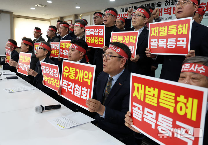[서울=뉴시스] 이영환 기자 = 홍천표 한국수퍼마켓협동조합연합회 이사 겸 서울권역 회장 등이 26일 오후 서울 영등포구 중소기업중앙회 상생룸에서 열린 재벌기업 온라인·새벽배송 허용 규탄 기자회견에 참석해 구호를 외치고 있다. 2026.02.26. [email protected]