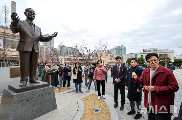 [대구=뉴시스] 이무열 기자 = 한동훈 전 국민의힘 대표가 26일 대구 북구 대구삼성창조캠퍼스를 찾아 삼성그룹 창업주인 이병철 회장의 동상을 살펴보고 있다. 2026.02.26. [email protected]