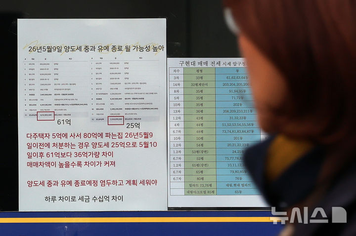 [서울=뉴시스] 조성우 기자 = 서울 강남3구(강남·서초·송파) 아파트값이 일제히 하락 전환한 26일 오후 서울 강남구의 한 공인중개사무소에 양도세 중과 유예 종료 관련 안내문이 붙어 있다.