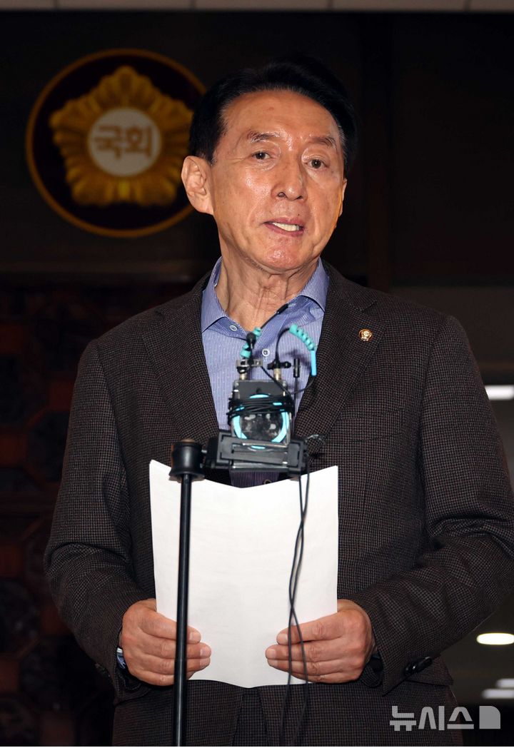 [서울=뉴시스] 조성봉 기자 = 김석기 국민의힘 의원이 26일 오후 서울 여의도 국회 로텐더홀에서 기자회견을 열고, 대구와 부산 지역 출마설이 돌고 있는 한동훈 전 대표에게 '출마가 아닌 백의종군 할 것'을 요구하고 있다. 2026.02.26. [email protected]