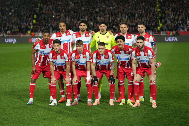 [베오그라드=AP/뉴시스] 츠르베나 즈베즈다 선수들이 26일(현지 시간) 세르비아 베오그라드의 라이고 미티치 스타디온에서 열린 2025-26 유럽축구연맹(UEFA) 유로파리그(UEL) 플레이오프(PO) 2차전 릴(프랑스)과 경기에 앞서 기념 촬영하고 있다. 설영우는 풀타임을 소화했으며 즈베즈다는 0-2로 패해 1,2차전 합계 1-2로 UEL 16강에 오르지 못했다. 2026.02.27.