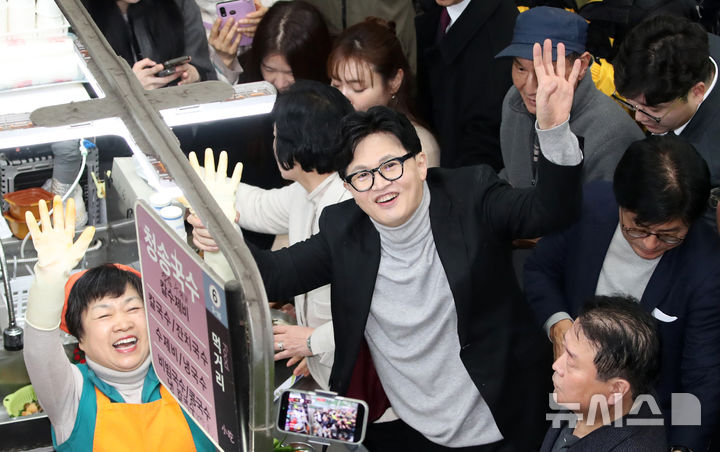 [대구=뉴시스] 이무열 기자 = 한동훈 전 국민의힘 대표가 27일 대구 중구 서문시장 국수골목을 찾아 상인과 함께 손을 흔들고 있다. 2026.02.27. [email protected]