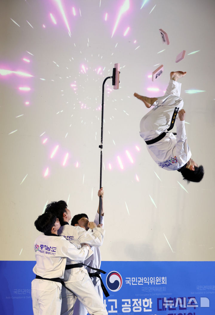 [세종=뉴시스] 강종민 기자 = 27일 세종시 어진동 정부세종컨벤션센터에서 열린 제14회 국민권익의 날 기념식에서 충남 태권도시범공연단이 '특혜' '강요' '향응' '청탁' '갑질'등을 격파하는 시범을 선보이고 있다. 2026.02.27. [email protected]