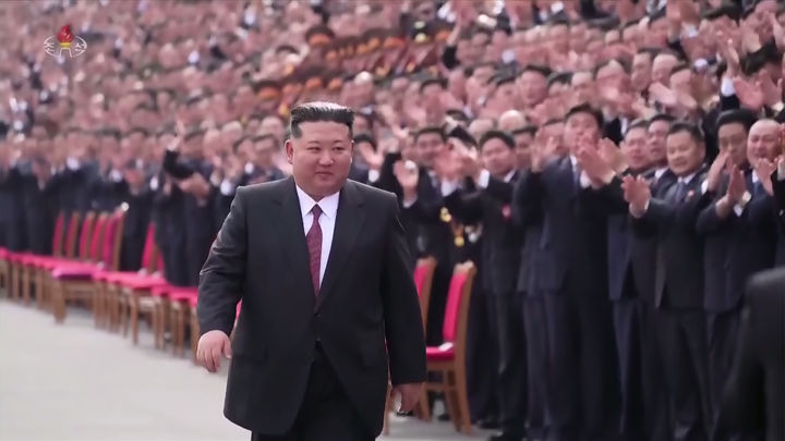 [서울=뉴시스] 북한 조선중앙TV는 김정은 국무위원장이 지난 26일 노동당 제9차대회 참가자들과 기념사진을 찍었다고 27일 보도했다. (사진=조선중앙TV 캡쳐) 2026.02.27. [email protected] *재판매 및 DB 금지